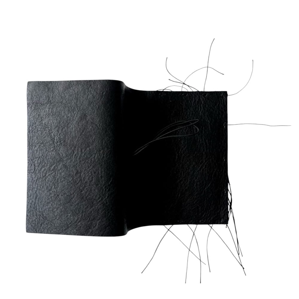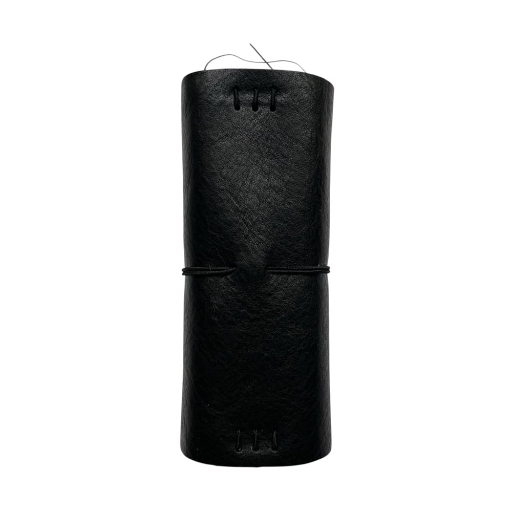 Our Loose Threads XL Journal is made from a black chrome-tanned leather. With an interior slip pocket that is secured with black untrimmed thread. Each journal comes with a black double elastic pull around closure and 1 notebook refill (3.5x5.5). The pocket journal can hold 3 notebook refills comfortably (or up to 6 refills). Imperfections may differ from each journal.