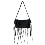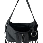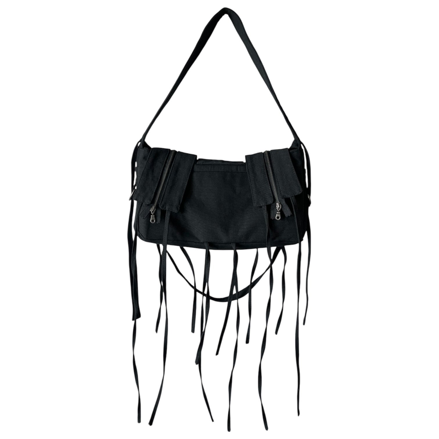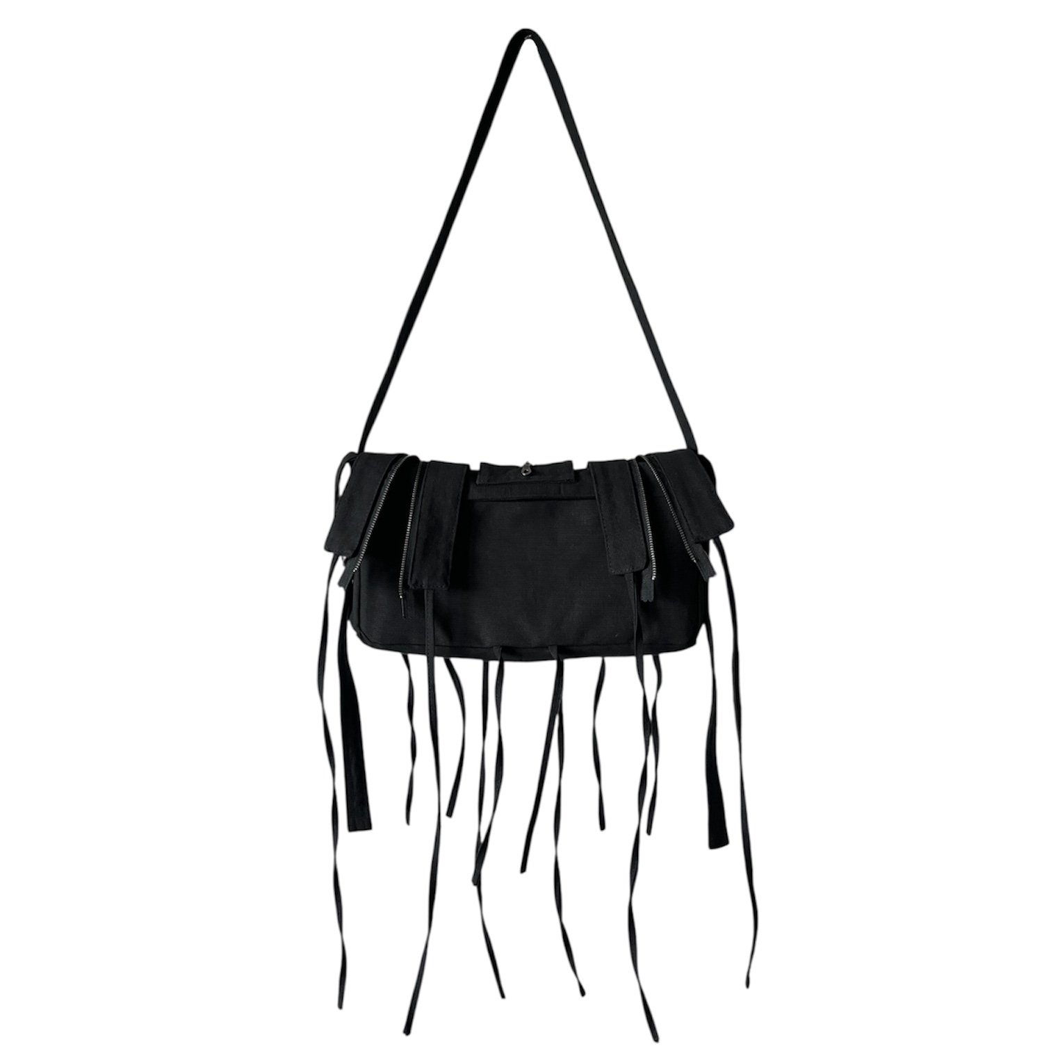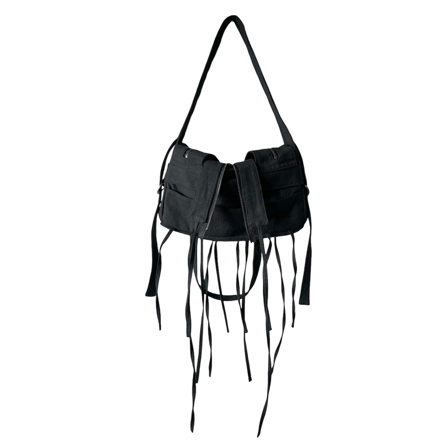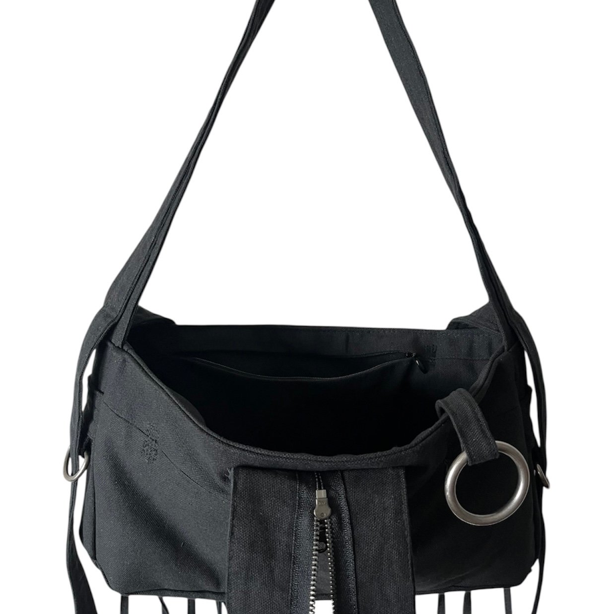 Maverick's Tri-State Bag is made of a black 100% cotton duck canvas. This bag features 3 inverted flaps with a zipper separating down the middle along with 2 string closures at the ends. 1 open face slip pocket on the back and a pocket on the front enclosed with an invisible zipper. The front and back panels of the bag are lined with a foam interfacing, with d-rings placed at the sides of the bag. At the top of the bag are double shoulder straps to accommodate both shoulder and crossbody use. On the inside of the bag there is a key leash with an o-ring and a hidden pocket enclosed with an invisible zipper. Cut & sewn in Austin, TX.