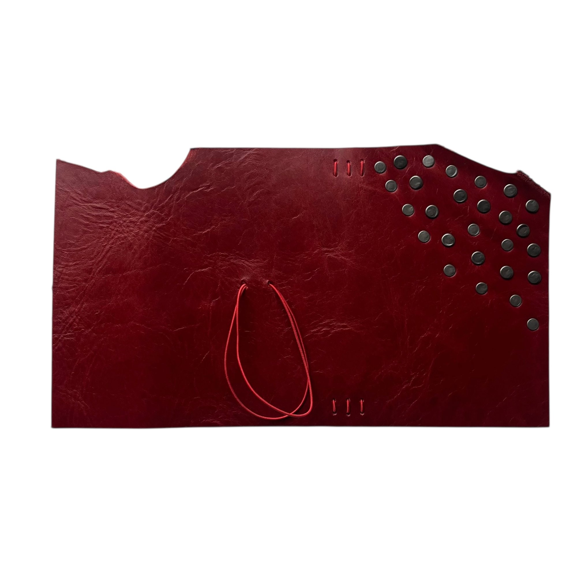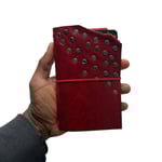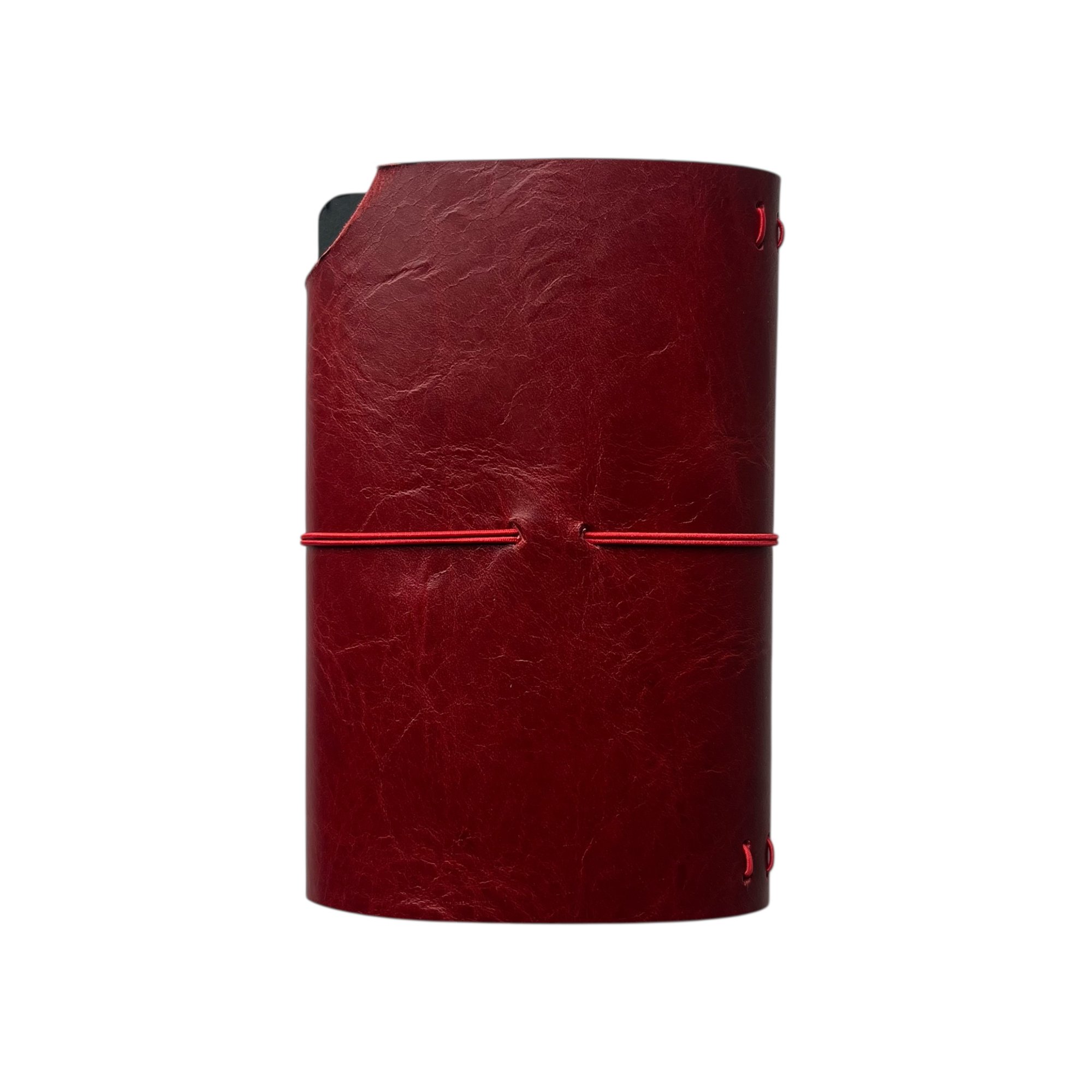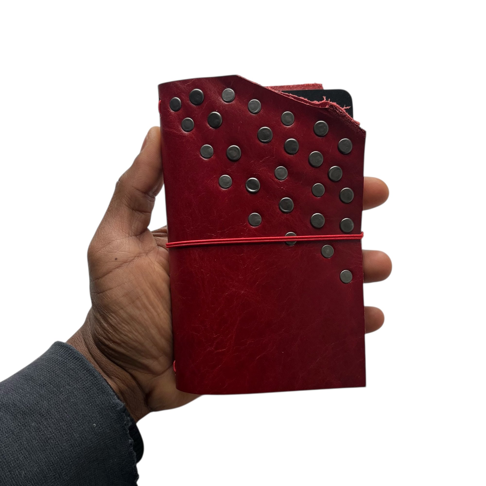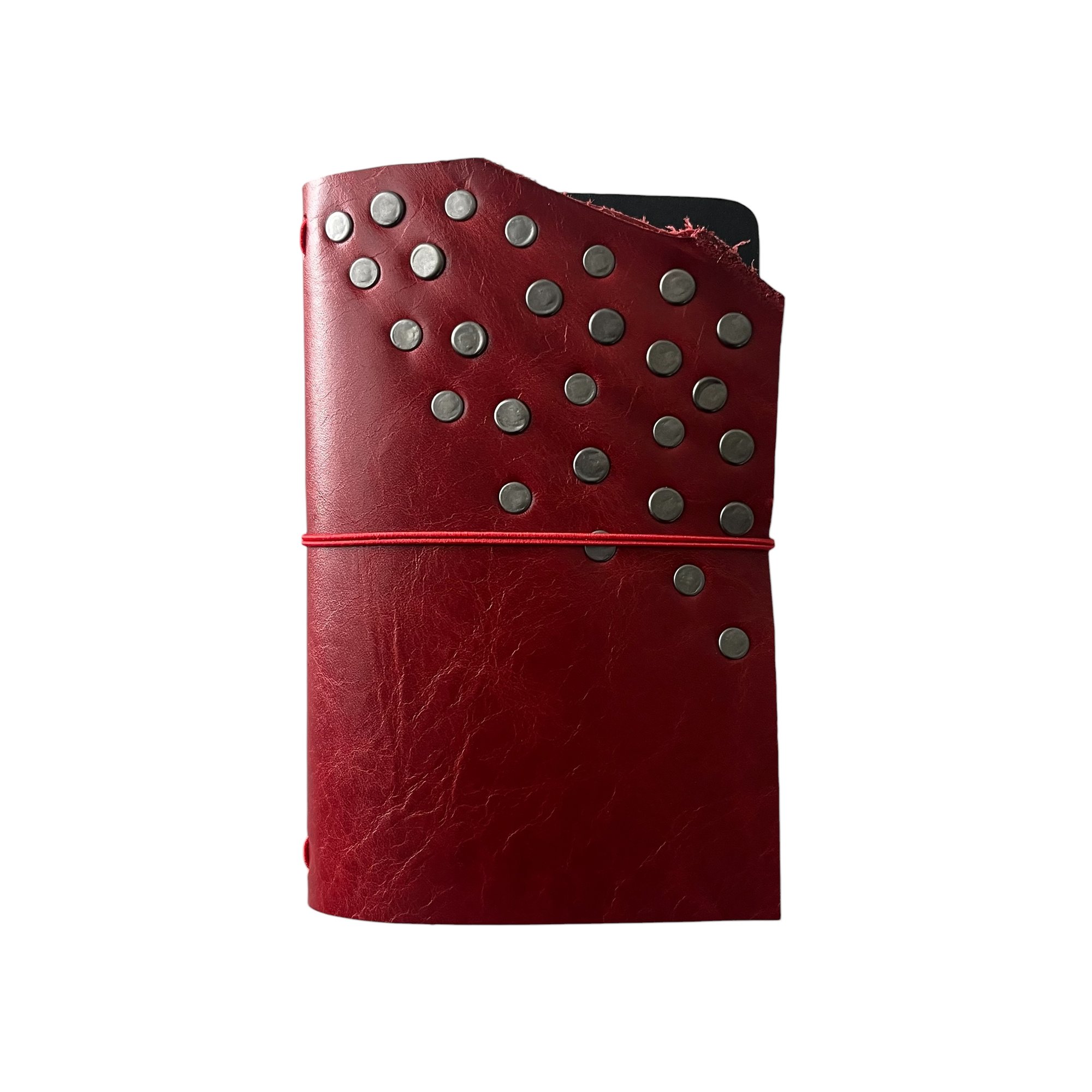 "My Dog Ate My" Pocket Journal is made from a red chrome-tanned leather with a pull up effect and finished with double cap rivets. This journal has intentionally torn edges and each journal comes with a red double elastic pull around closure and 1 notebook refill (3.5x5.5). The pocket journal can hold 2 notebook refills comfortably (or up to 4 refills). Cracking, distressing, & imperfections may differ from each journal.