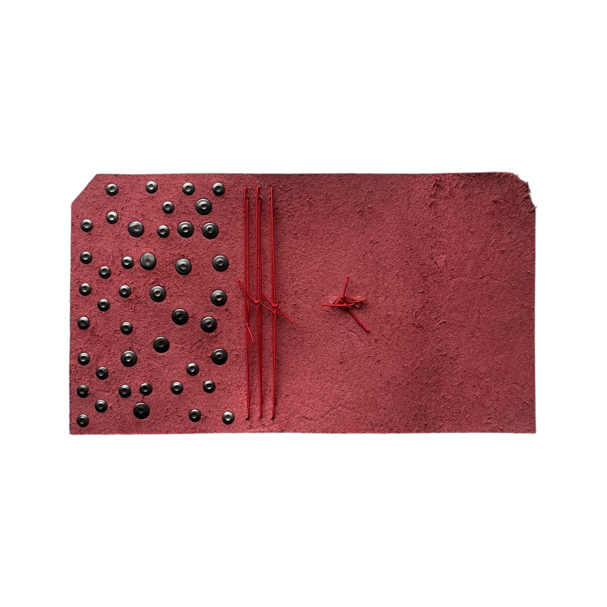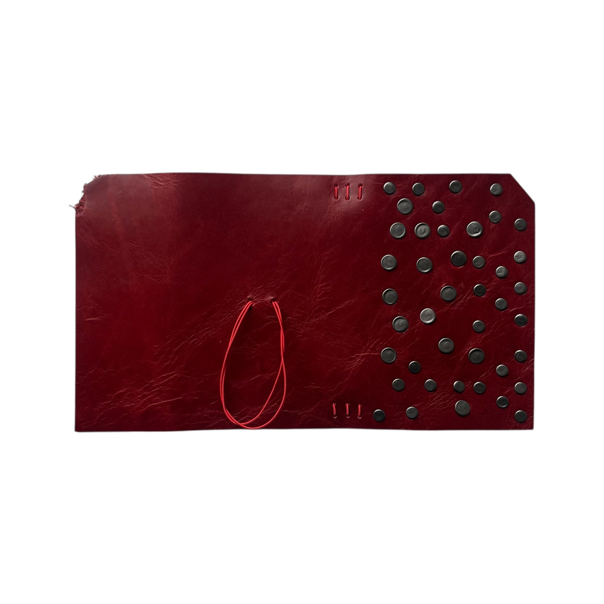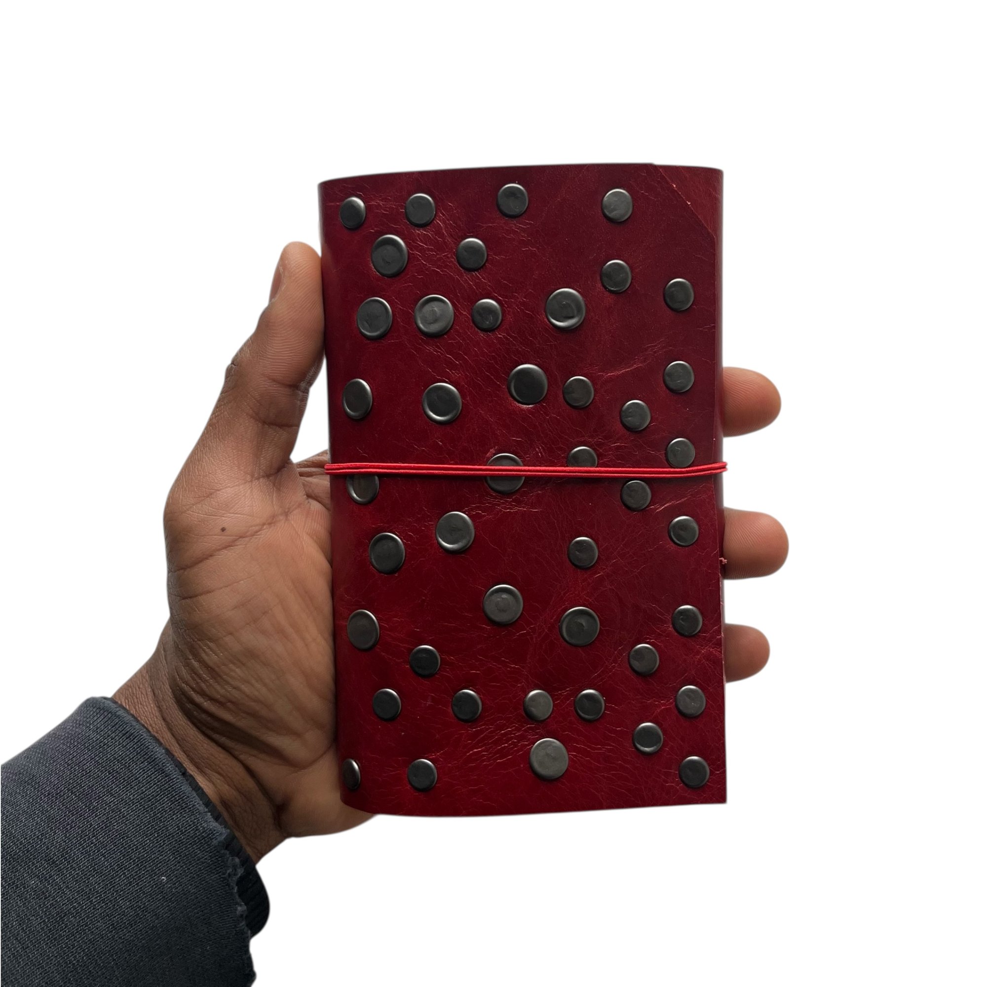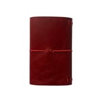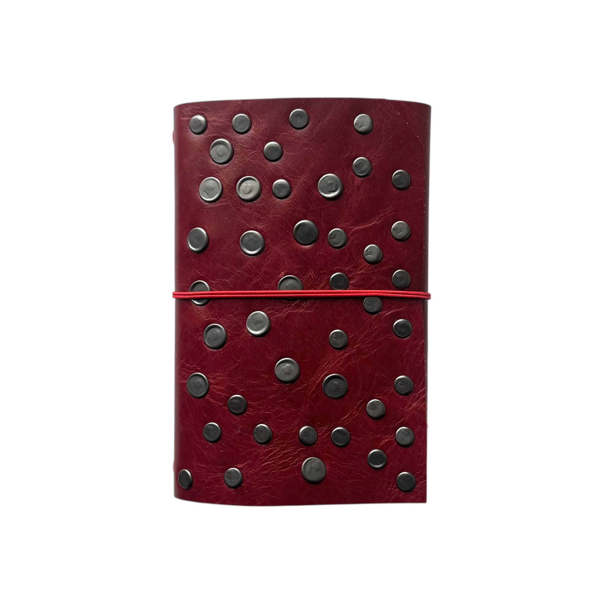 The Pocket Journal is made from a red chrome-tanned leather with a pull up effect and finished with double cap rivets. This journal features a slightly distressed corner and comes with a red double elastic pull around closure and 1 notebook refill (3.5x5.5). The pocket journal can hold 2 notebook refills comfortably (or up to 4 refills). Cracking, distressing, & imperfections may differ from each journal.